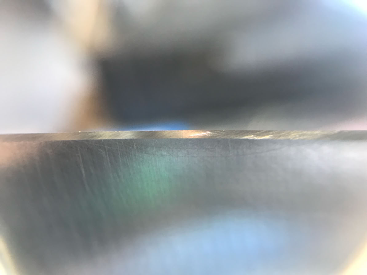 Same knife after edge restoration using 50, 80, 100, 200 grit diamond stones and then sharpening and polishing with 400, 600, 800, 1000, 1500 diamond stones.