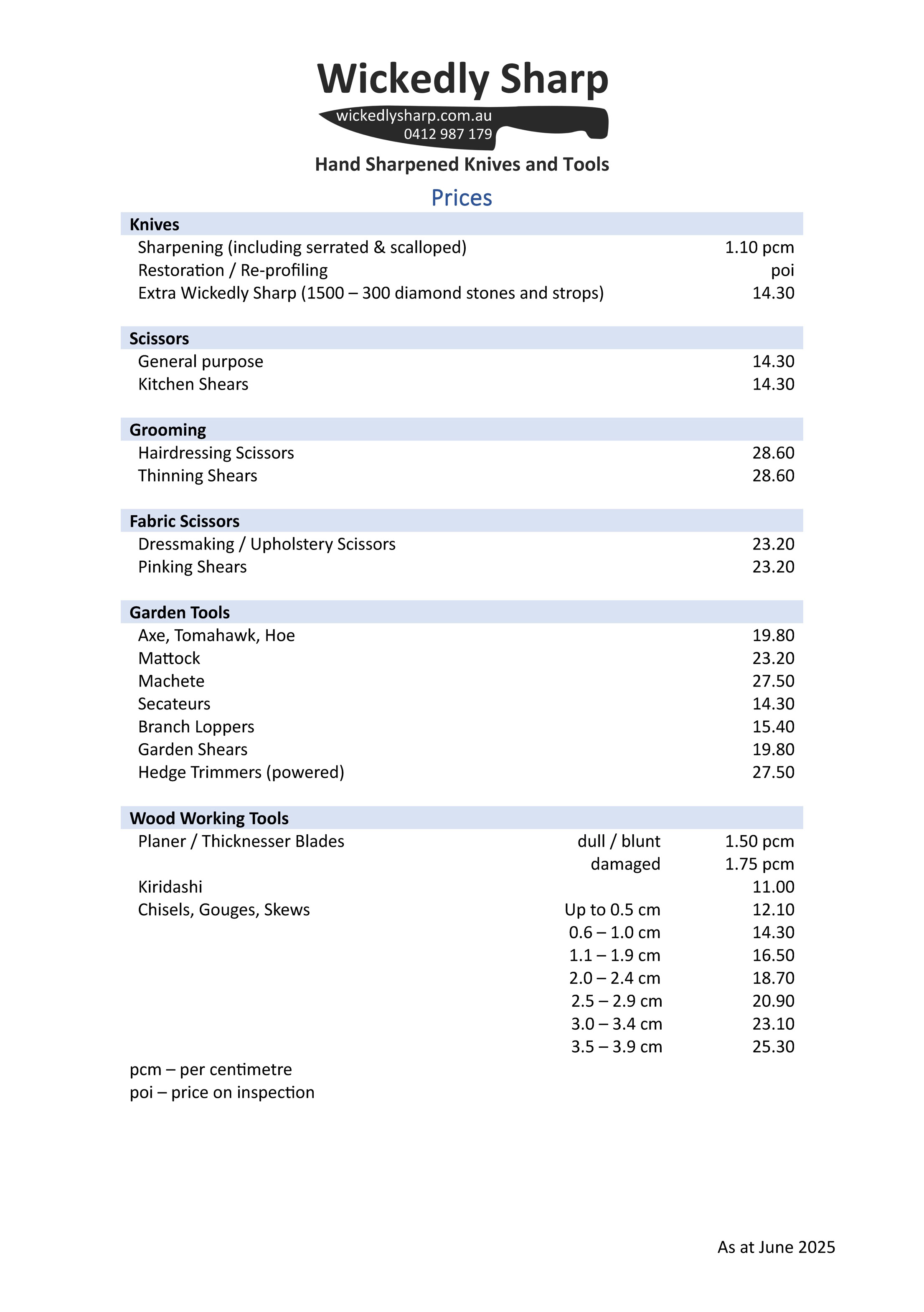 I would like to thank my clients for their feedback on how I could improve the service I provide. One of the main points was to make the pricing structure simpler! This has been done and with reduction in the cost of the investment to you while still receiving the highest standards of care for your knives, scissors and tools and personal service.